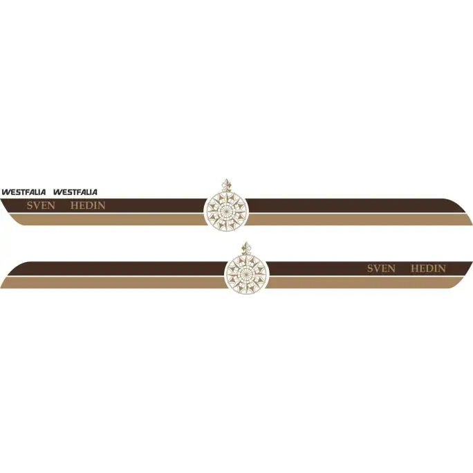 KIT VINILO VW Westfalia SVEN HEDIN. Réplica del vinilo original. Se entrega con instrucciones para el montaje. Restaura al 100% tu Sven Hedin, quieres restaurar tu LT Sven Hedin para devolverla a su estado original? Este kit incluye las franjas laterales, 2 logos laterales, dos rosas de los vientos y dos logos westfalia para el techo.